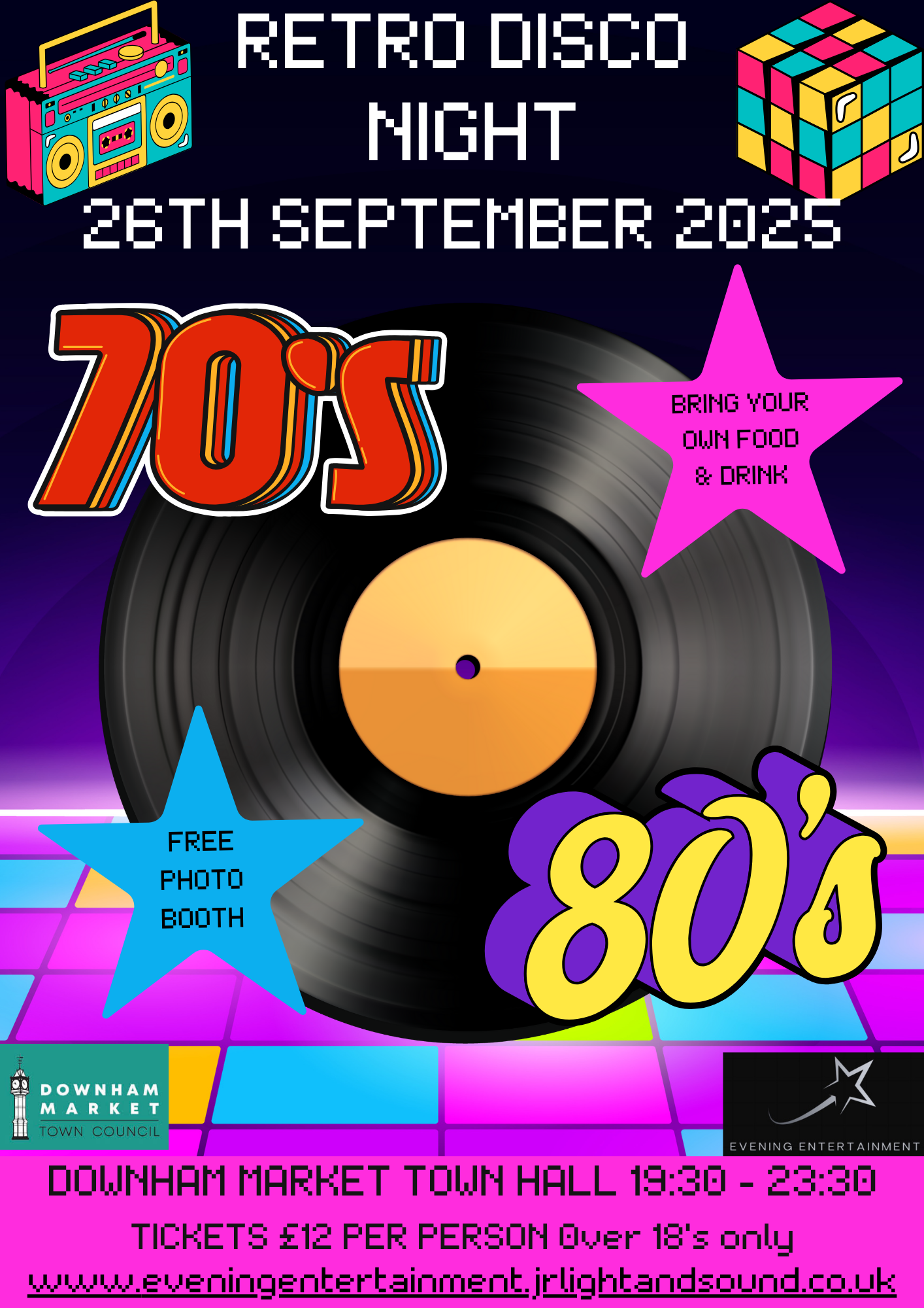 Welcome to the grooviest party in town - the '70's & 80's Disco'! Get ready to dance the night away to all your favorite hits from the disco era. Put on your bell-bottoms, grab your neon leg warmers, and head over to Downham Market Town Hall for a night of nostalgia and fun. Let's boogie down and relive the best music from the '70s and '80s. Don't miss out on this blast from the past - see you on the dance floor!